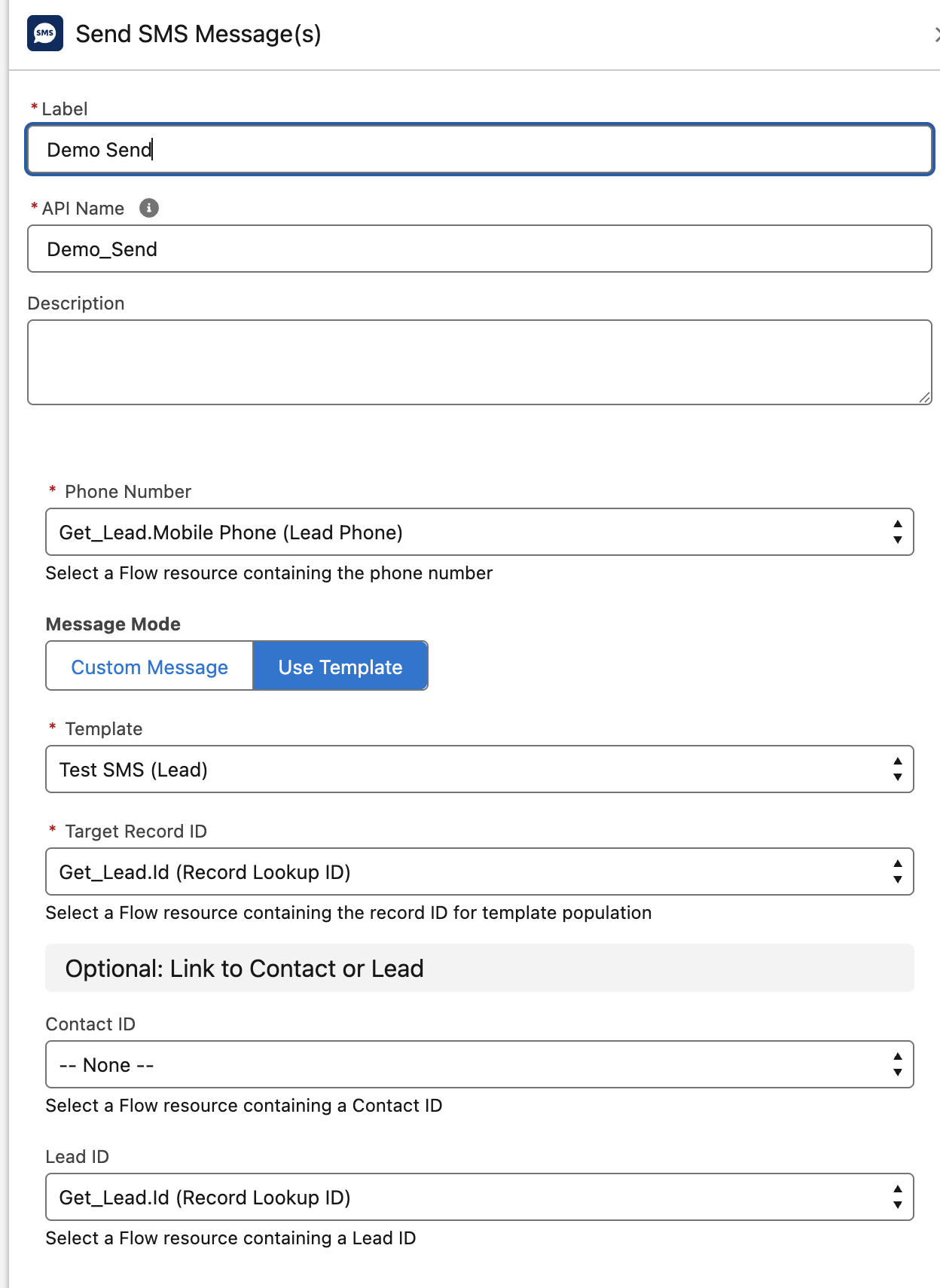 As shown the action is stored in the "Messente" category. The action can utilise a template as shown in the screenshot, or a custom message, in which you link to a text variable.